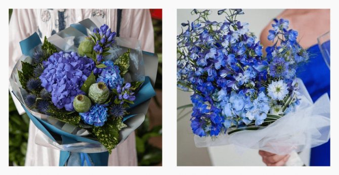 Букет с цветами синего цвета можно подарить учителю, молодым родителям мальчика, мужчине, чтобы подчеркнуть его статусность. Свадебный букет тоже может состоять из синих цветов, передавая силу и крепость брака.