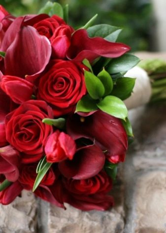 Необычно будет выглядеть букет из калл, олицетворяющих счастливый брак и защиту семьи. Оригинальный вид цветка позволяет создать очень привлекательный букет.