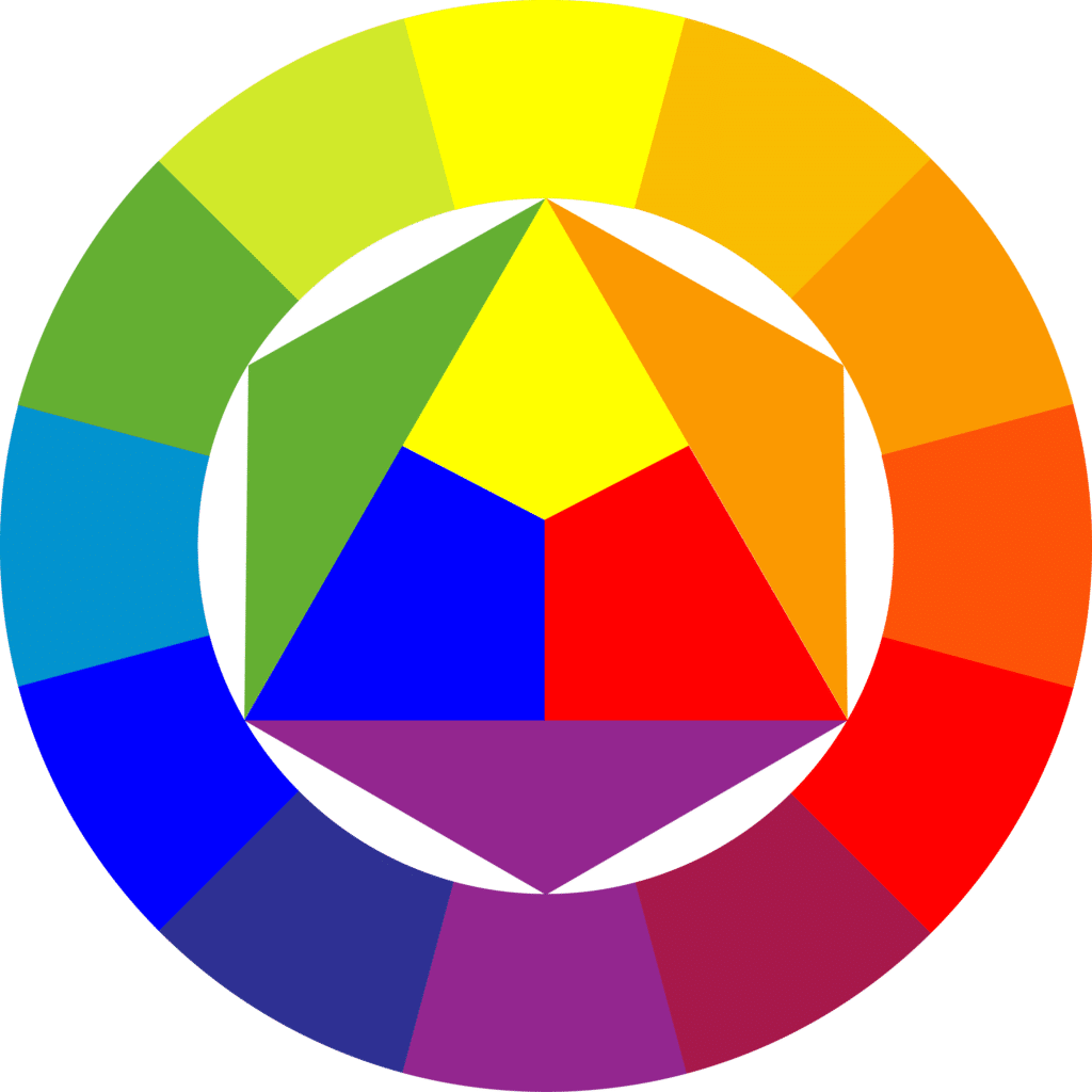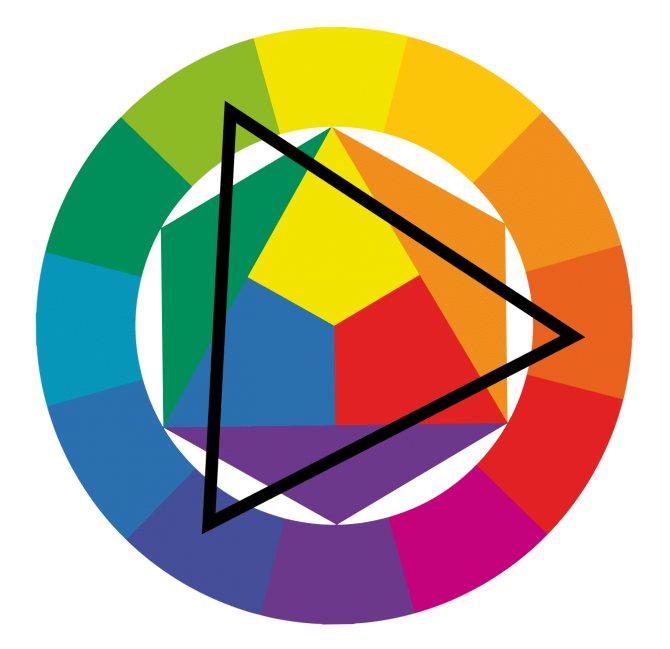 Цвета на круге расположены в таком порядке, что если наложить на него несложную схему, то получится гармоничное сочетание. Например, берем схему в виде треугольника, накладываем поверх круга и видим самую простую гармонию.