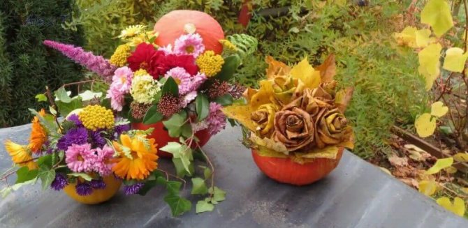 - В качестве главной составляющей флористы осенью часто используют яблоки, ягоды калины или миниатюрные тыквы.