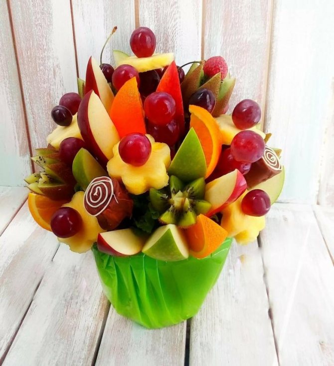 Фруктово-овощные композиции довольно массивны, чтобы они простояли дольше и внешне выглядели завершенными, можно поставить их в самодельную вазу. Подойдет тыква или крупный кабачок. Выбрать нужно красивый, плотный и подходящий по размеру плод.