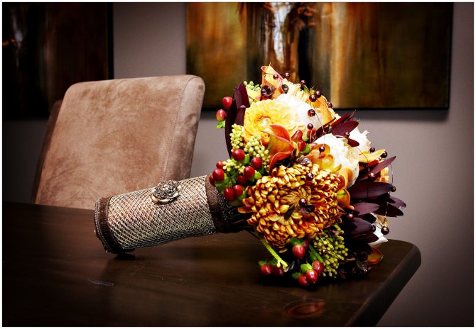 Особенностью осеннего свадебного букета являются выразительность, неординарность и многоцветие. В оформлении используют минимум зелени. Добавить изюминку можно с помощью золотых листьев, желудей или лент.