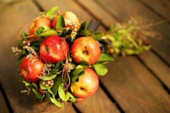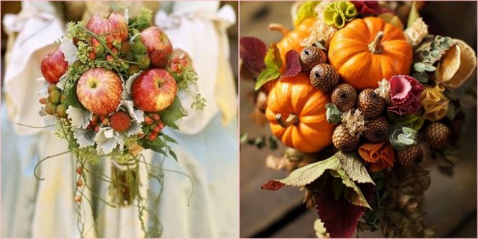 Оригинальными получаются сочетания с фруктами, например, с небольшими яблочками или гроздями винограда, а также с сезонными овощами – маленькими тыквами, кабачками, морковью, брокколи. Можно и вовсе составить настоящий шедевр для невесты полностью из них.