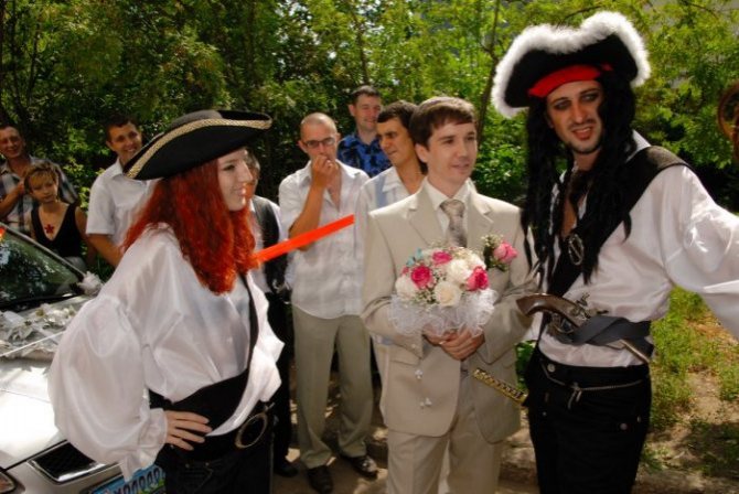 Выкуп невесты в стиле «Пираты Карибского моря», «Зорро», «Кавказская пленница», «Форт Баярд», «Давай поженимся» и т.п. Главным пособием при подготовки такого выкупа должна стать кинолента/телепередача, в которой вы найдете как примеры костюмов, так и идеи для конкурсов.
