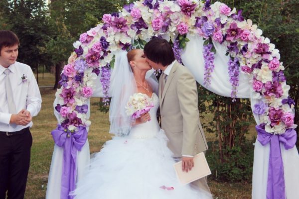 В целом организаторы отзываются о сиреневой свадьбе положительно. Декор смотрится броско и живо, стимулирует присутствующих к активным действиям. Зимой и осенью можно подобрать темные и насыщенные ноты сиреневого, в теплые месяцы – светлые легкие оттенки. У сиреневого есть множество тонов – от насыщенного холодного до воздушного и нежного цветочного оттенка. Посмотрите, как необычно смотрится арка для молодых и общее оформление свадьбы в сиреневом цвете, фото ниже: