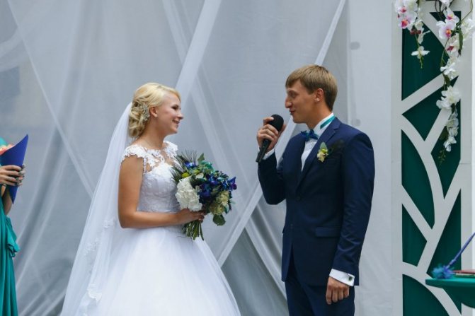 - Жених, обращаясь к своей молодой жене, говорит, что не может больше молчать и скрывать от нее правду. Именно в такой торжественный момент он в присутствии самых близких друзей и родных людей должен признаться. Это время для небольшой паузы. Сейчас можно взглянуть в глаза невесте, чтобы прочесть в них удивление, нетерпение, а порой даже страх. Добившись желаемого эффекта, жених продолжает говорить о том, что долго терпел, старался скрыть то, что спрятано в самых дальних уголках его души, но сегодня понял, что скрывать это дальше нет сил, и он вынужден признаться. Вновь небольшая пауза. Спустя несколько секунд он берет невесту за руку и, глядя в глаза, говорит о том, как сильно он ее любит, что решение жениться он принял еще год назад, но никак не решался сделать предложение, боясь отказа. После таких слов лучше сразу поцеловать любимую, не давая ей опомниться.