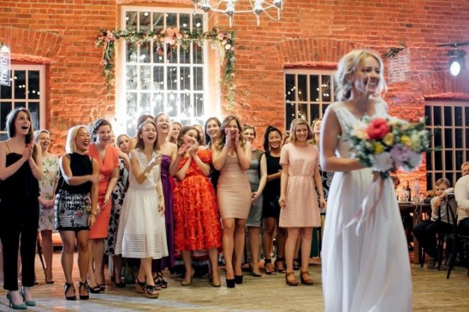 - Еще идея ‒ сделать счастливыми сразу несколько девушек. Для этого нужно скрепить букет одной ленточкой. Невеста быстро развязывает ее, кидая букет. Цветы летят «врассыпную», и у каждой гостьи есть шанс поймать «свадебный вестник».