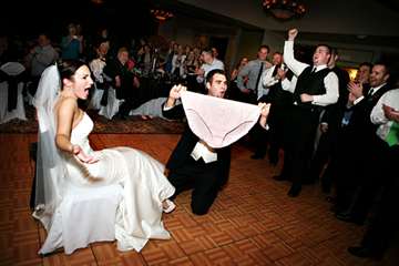 Еще более весело можно разыграть друзей жениха. Когда жених снимает с ноги невесты подвязку, он должен незаметно вынуть из рукава женские трусы самого максимального размера.