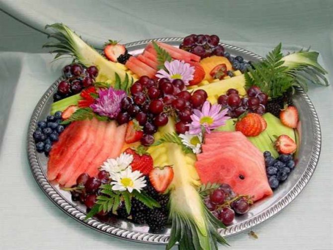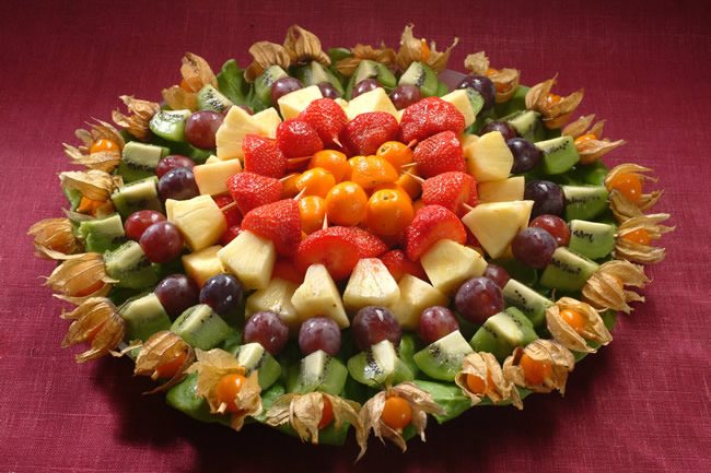 В качестве десерта непременно должны присутствовать фрукты и ягоды. В каждом сезоне свои фавориты. Ранним летом клубника и черешня. Затем малина, черника, смородина, вишня. На смену им приходят груши, яблоки, сливы и виноград, дыни и арбузы. Сейчас в любое время года на рынке без труда найдёте самые разнообразные фрукты. С их помощью можно украсить десерты, праздничный торт и просто тарелки с угощениями: