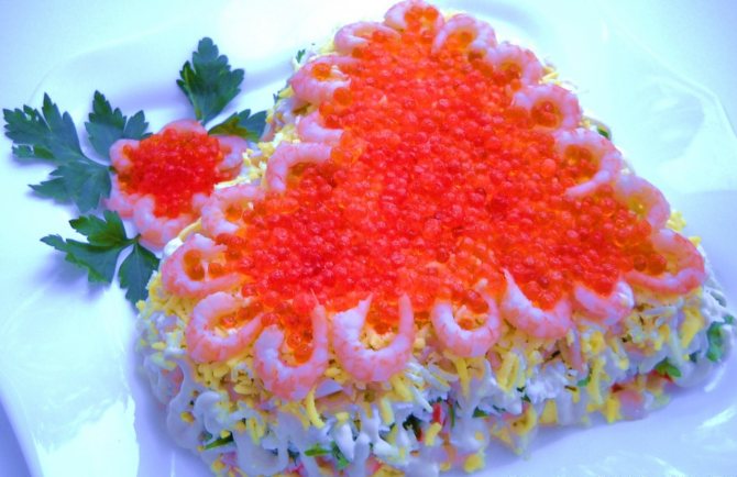 Почему бы не приготовить салат с таким импозантным названием? Он вполне подойдет для свадебного банкета. Сладковатый привкус крабовых палочек в тандеме с яблочной кислинкой — неожиданный приятный вкус.