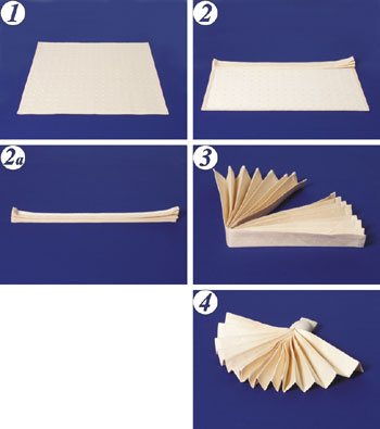 1. Исходно салфетка в расправленном виде лежит лицевой стороной вниз. 2. Сложите салфетку «гармошкой» (2а). 3. Согните ее в середине пополам. 4. Заправьте салфетку в кольцо (либо поставьте в бокал) и расправьте «веер».