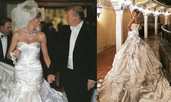 Жена миллиардера Дональда Трампа шла под венец в роскошном платье за 100 тысяч долларов весом в 12 килограмм, сшитом из атласа и декорированном бриллиантами. Заметим, что круглые цветы на юбке мы уже видели – на фото Жаклин Кеннеди.