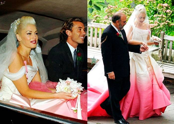 На фото ниже, творение Веры Вонг (США) для Виктории Бекхэм, признанное одним из шедевров свадебной моды: красивый шелк жемчужного оттенка, открытые плечи, знаменитый корсет (дизайнер корсета – Mr. Pearl), пышная юбка, шикарный шлейф длиной около 6 м.
