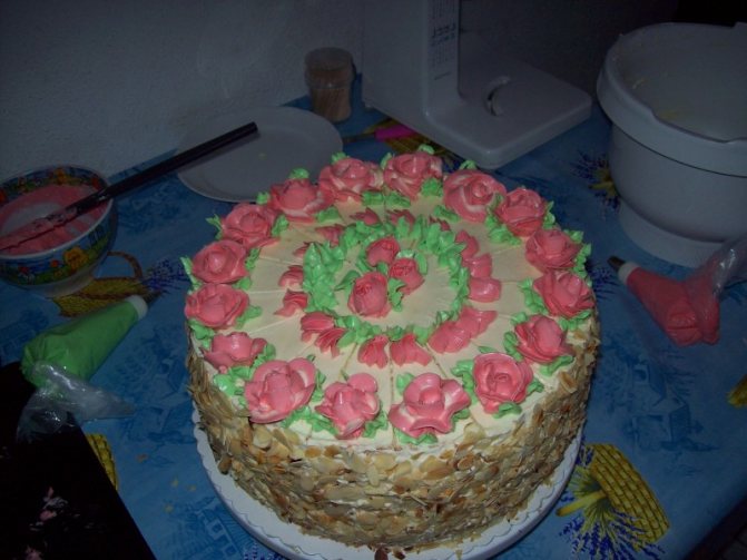 Готовые коржи, промазанные начинкой и подогнанные к одному размеру, в большинстве случаев покрываются либо мастикой, либо кремом. Второй вариант начал применяться гораздо раньше, и с недавнего времени начал расцениваться, как банальный и безвкусный. Кремовые розочки и узоры смотрелись однотипно, поэтому убивали любую индивидуальность праздника.