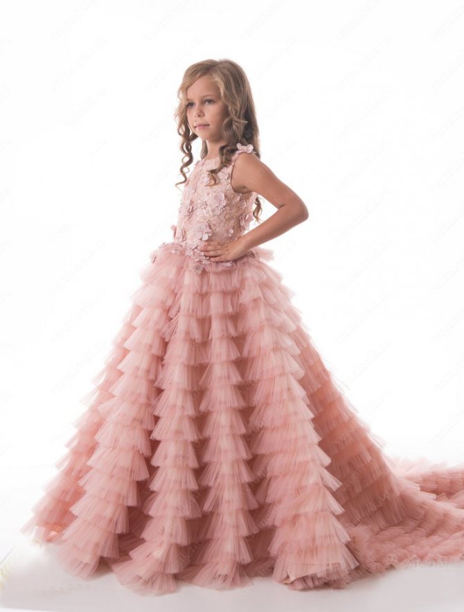 Фасон может быть как коротким, так и длинным. Что касается самого шлейфа, он может ниспадать, или быть воздушным, прямым или в виде волана. Лучше остановиться на коротком, потому что длинные маленьким девочкам носить тяжело.