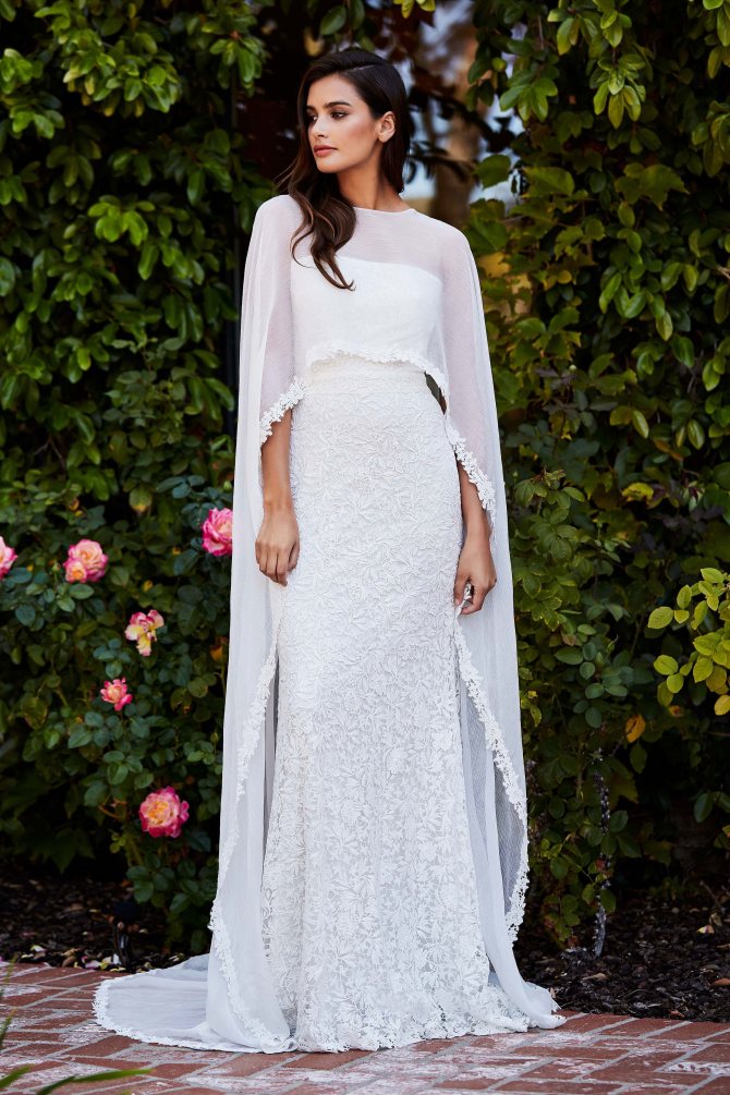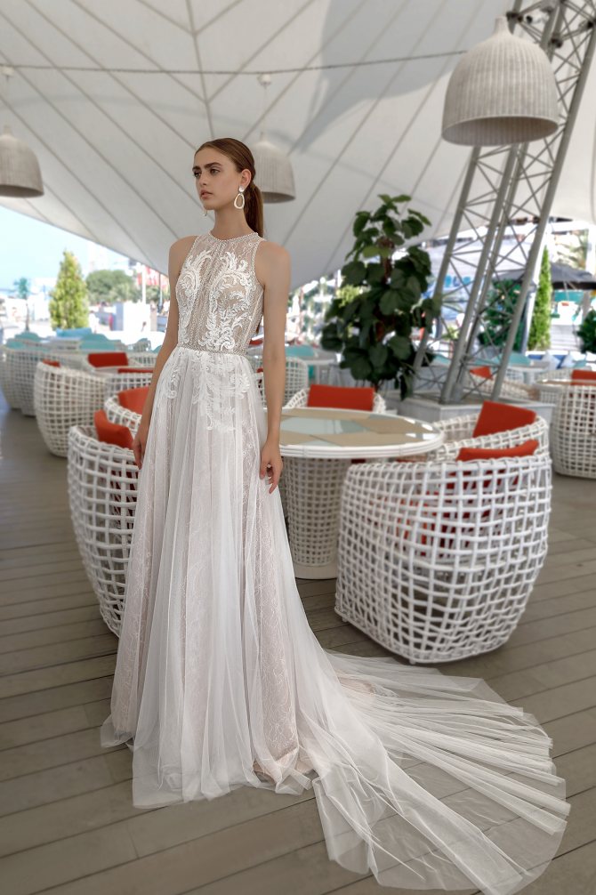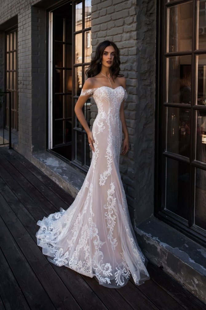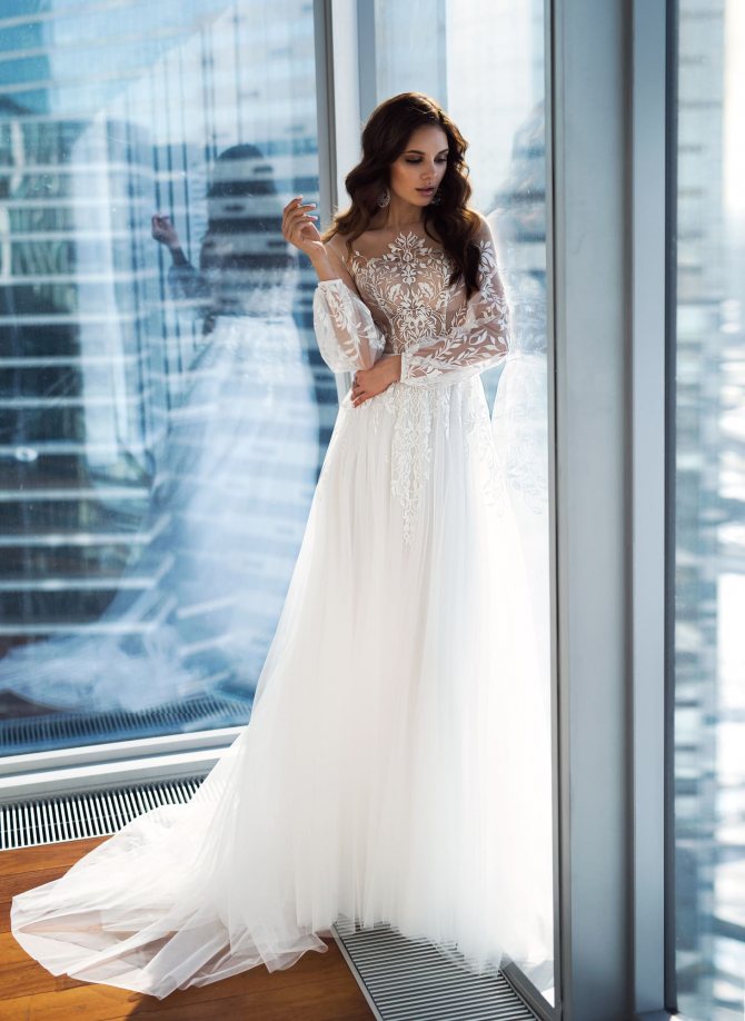 Приталенный фасон, дополненный воздушным шлейфом сделает образ элегантным.