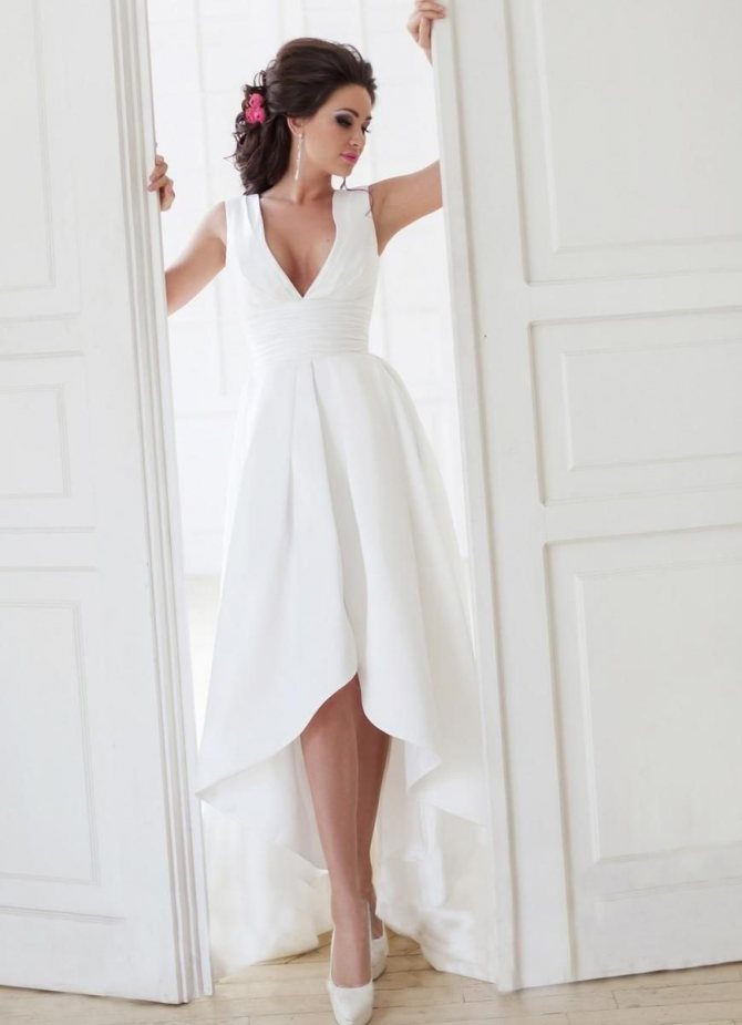 Также в продаже можно найти короткие платья со шлейфом. Они обладают неординарным внешним видом и за счет этого привлекают особое внимание.