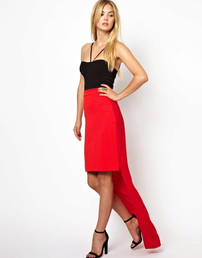 Оригинальное решение – асимметричная юбка. Спереди она не выше колена, а сзади – доходит до пола. Шлейф не будет волочиться сзади, не придется волноваться, что на него кто-то наступит.