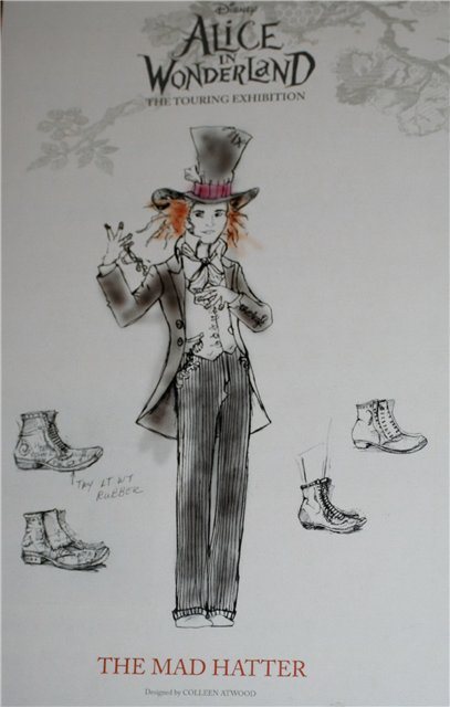 Работу над костюмом Шляпника Этвуд, что не удивительно, начала со шляпы. «Его шляпа сделана по реальному образцу тех лет, только пропорции слегка изменены. Будучи в Италии, я наткнулась на образец кожи, обработанной лазером, со странным узором, будто изъеденной червями, и отдала его одному замечательному шляпнику из Лондона. Потом мы украсили её золотом и подвязали на манер кушака роскошной лентой. Получилась деталь, которая относилась к прошлой жизни героя Деппа в клане шляпников.
