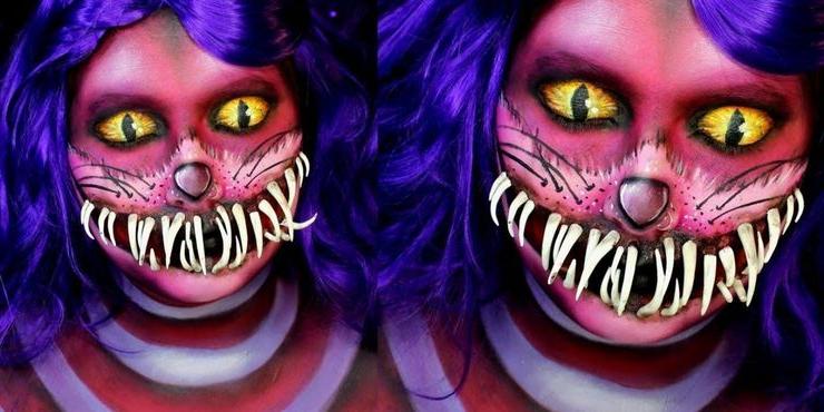 Многим людям нравится Чеширский Кот из-за его необычного образа. Весь его окрас состоит из пурпурных и розовых полос, что смотрится довольно оригинально. Также его отличительными чертами являются глупый, но добрый характер и жутковатая улыбка. Для костюмированной вечеринки стоит сделать симпатичный макияж, вдохновленный этим котом.