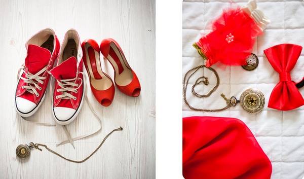 В сценарий можно включить конкурсы с переодеванием и элементами «Ателье мод Красной Королевы». Заранее для гостей нужно приготовить костюмы и аксессуары, и праздник превратится в фототеатр. Участники свадьбы смогут принять участие в постановочных фото, разыграв эпизоды их любимой сказки. Выполненные во время церемонии фотографии можно вручить гостям в качестве призов в конкурсной программе. Интересным приемом будут фигурные фото или фото-наклейки на небольшие сувениры в стиле свадьбы.