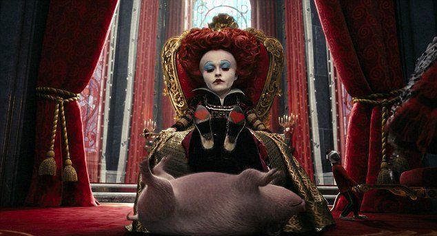 Кстати, полоска и сердечки — тема Красной королевы. Во многих сценах – у Красной королевы червей – я заметила полоску в костюмах практически всех персонажей: у Алисы на платье, у Шляпника на жилете, у Трулляля и его брата… Рождается ассоциация с тюремной полоской, а если впомнить, что любимое занятие королевы было рубить головы…