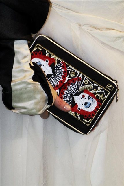 На рисунке видно, что все тут подчинено одному символу – сердечку с игральных карт. Какая интересная ритмическая игра! «В костюме я работала с традиционными цветами игральных карт: красный, черный, золотой и белый. В этом костюме много линий, повсюду вышиты позолоченные сердечки, – рассказывает она. – Я хотела оставить элемент иронии и безвкусицы, потому что Красная Королева, если честно, барышня довольно дурных вкусов. Так что платье у неё не из самого дорогого шёлка. Это дешёвый материал, дающий более сильный графический образ.