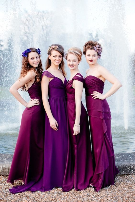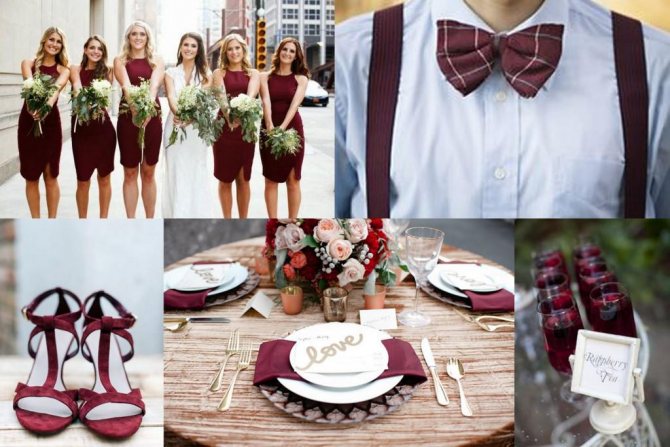 Невесту можно одеть в белое, а ее подружек – в бордовое. Также допустимы другие оттенки. Если подружек невесты несколько, то лучше продумать их наряды таким образом, чтобы они сочетались друг с другом.