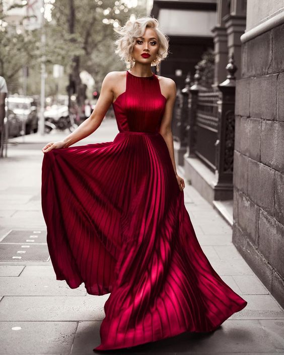 Чтобы удачно подчеркнуть понравившуюся стилистику мероприятия, девушка может надеть на свадьбу платье бордового цвета. Для данного тона подойдёт приталенный наряд с длинным подолом.