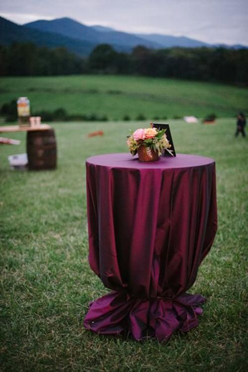 Скатерти для столов предпочтительно белые или винного цвета. Используют стулья, обтянутые бордовой тканью. Для укрытия от непогоды, если внезапно пойдет дождь, устанавливают просторные шатры. Их декорируют лентами, тканью, вуалью, натуральными и искусственными цветами, воздушными шарами. Место непосредственного проведения торжественной церемонии можно усыпать лепестками алых роз.