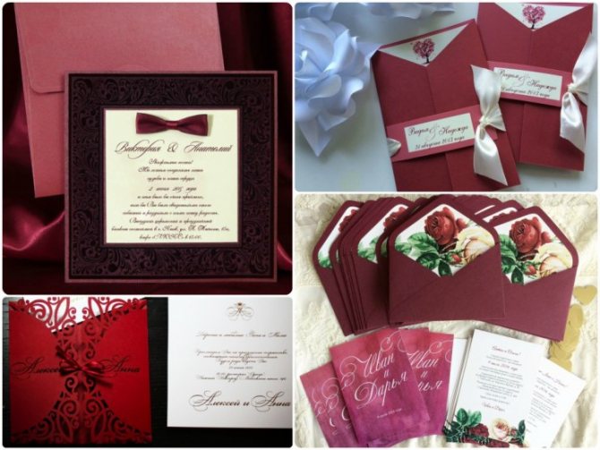 Чаще всего сочетают винные, гранатовые, марсала с белыми или кремовыми розами. Могут добавляться банты, ленты, кружева, фрукты и ягоды нужного цвета.