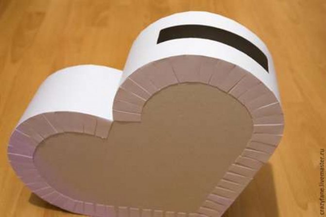 Намного проще, чем тот же сундучок. Вырез может располагаться в самом сердце, или же в боковой его стороне, но в таком случае эти грани должны быть прямыми, но никак не выпуклыми, поскольку на одной стороне казна будет стоять, а во второй будет прорезь для конвертов. Небольшой мастер класс.