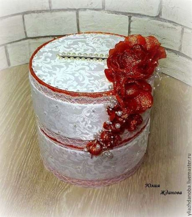 Довольно распространена форма свадебной кассы – это коробка с выпуклой «дутой» крышкой, в которой есть прорезь для денег. Вариантов декора масса, и ограничиваются они лишь рамками ваших индивидуальных требований. Такую вещь можно сделать из коробки подходящего размера, а можно сделать самостоятельно с ноля. Мини мастер класс поможет разобраться в деталях.