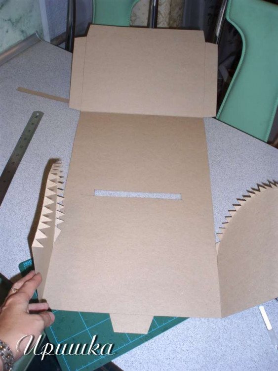 Для этого из плотного картона нужно вырезать полосу 20 на 50 см (размеры могут произвольно меняться). Эта полоса склеивается, под нее вырезается основание, с припусками на приклеивание, которые надо нарезать бахромой. Склеить основание с боковой стороной.