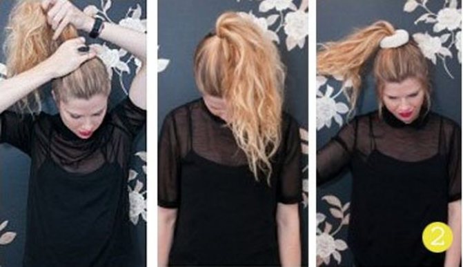 - Если резинку разместить повыше, то можно получить хвост, в основании которого будет симпатичный пучок.