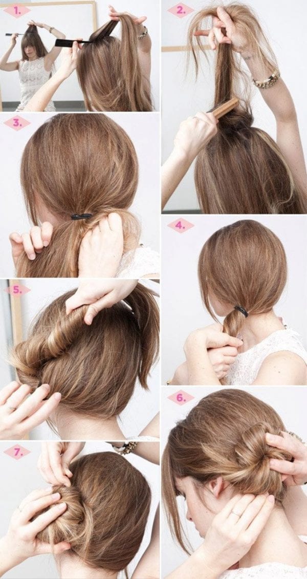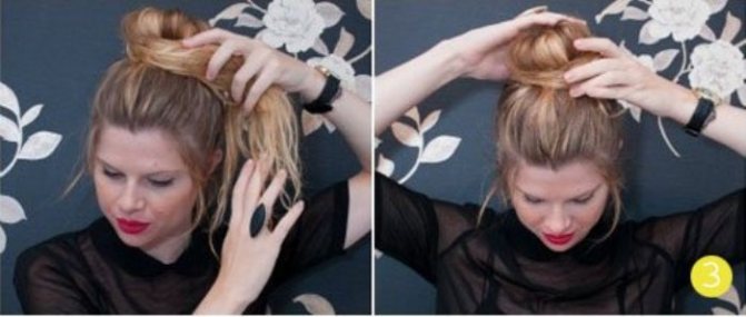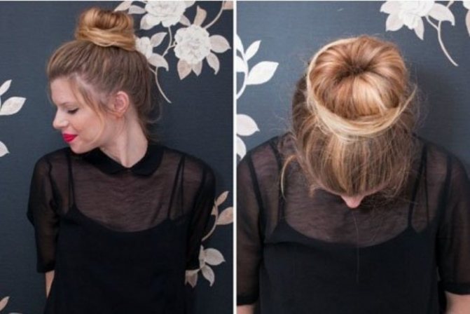 Делается высокий конский хвост и фиксируется у основания резинкой под цвет шевелюры. Далее локоны снова расчесывается и на их кончики надевается бублик, его нужно аккуратно поворачивать, так чтобы волосы закутывались возле него. Нужно сделать так, чтобы бублик был полностью закрыт. Все торчащие волоски крепятся к основанию пучка шпильками, и вся причёска сбрызгивается лаком.