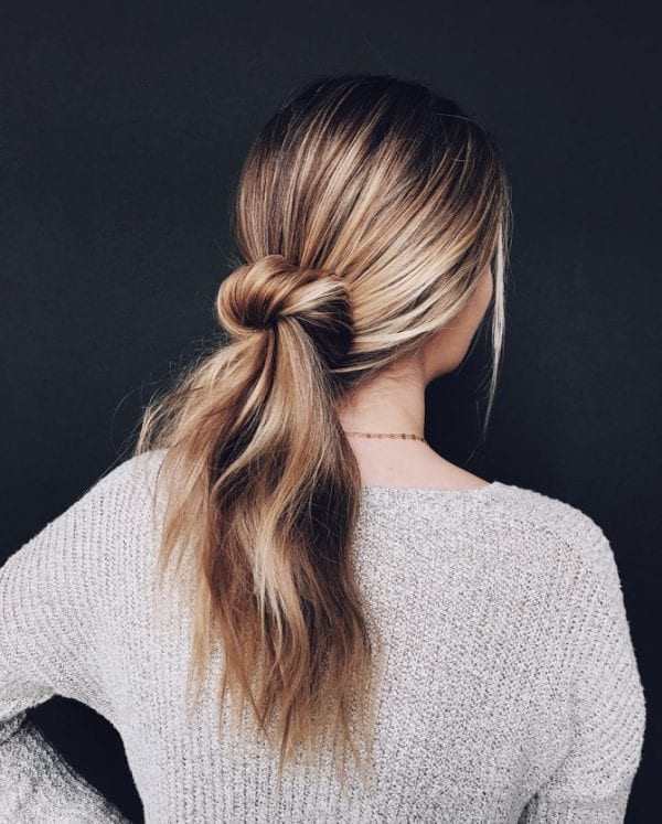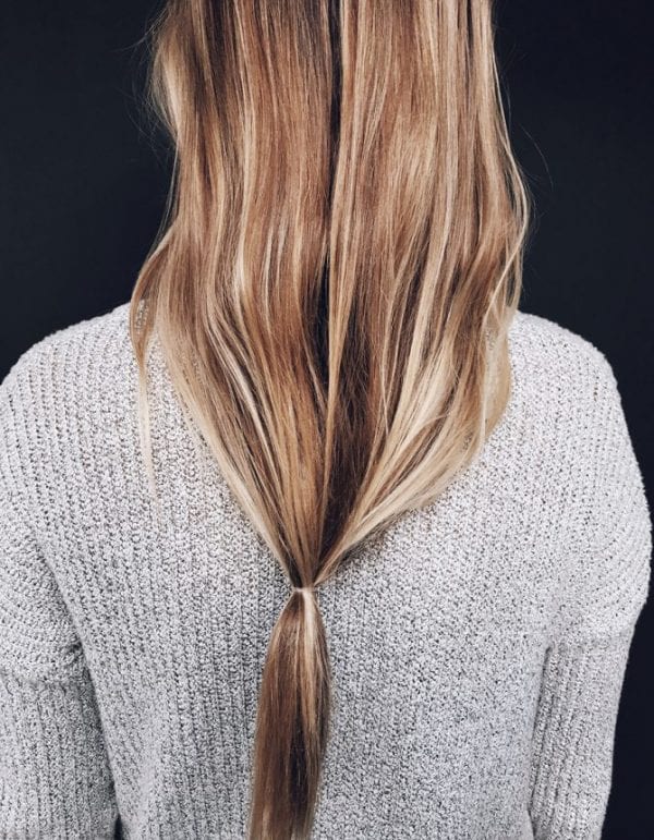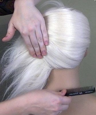 - Расчешите волосы по всей длине, соберите их в низкий хвост и протяните резинку вниз, почти к самым кончикам.