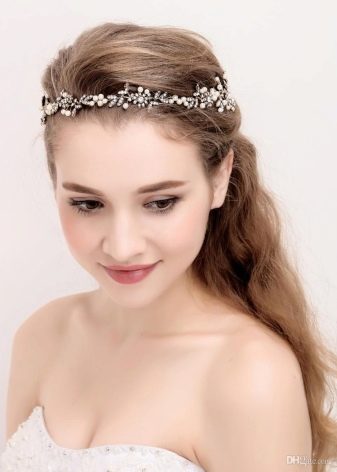 Очень интересный вариант диадем. Его можно крепить обычным способом – сверху головы либо аккуратно опускать до самого низа локонов. Такое украшение выглядит шикарно и больше подходит невестам с длинными и густыми волосами.