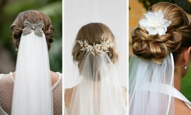 А вот если фата тонкая и однослойная, то с необычными пучками и укладками вполне можно пофантазировать.