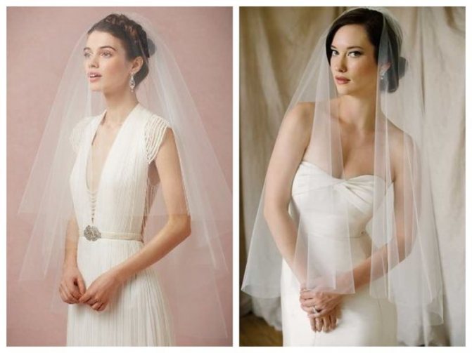 Также можно собрать волосы в узелок без дополнительного объема. Коса в греческом стиле и распущенные волосы сочетаются с фатой средней длины.