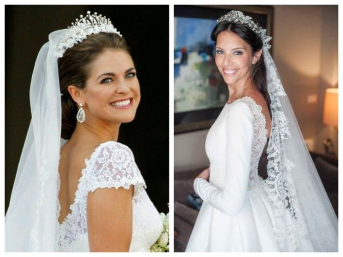 Не рекомендуется сочетать короткую фату с высокой прической в королевском стиле. Такой вариант гармонично смотрится с длинной фатой и тиарой или диадемой.