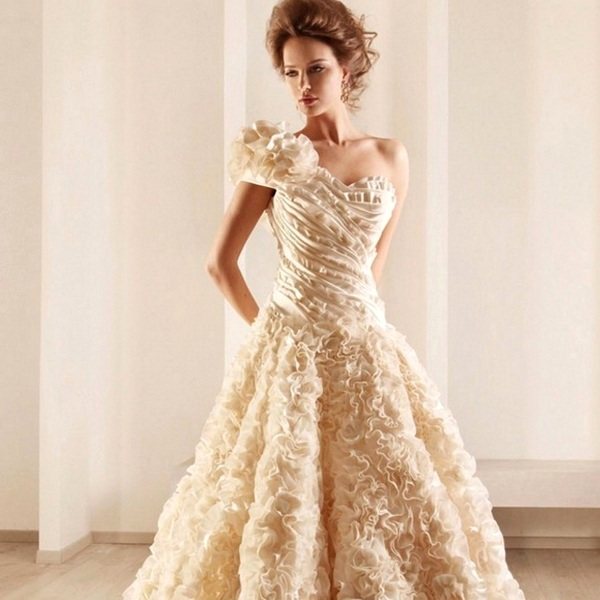 Несмотря на то, что цвет «айвори» не сильно отличается от привычного белого, невесты в нарядах кремовых тонов выглядят роскошно и необычно. Образ получается дорогой и очень выигрывает в сравнении с синюшно-белыми платьями.