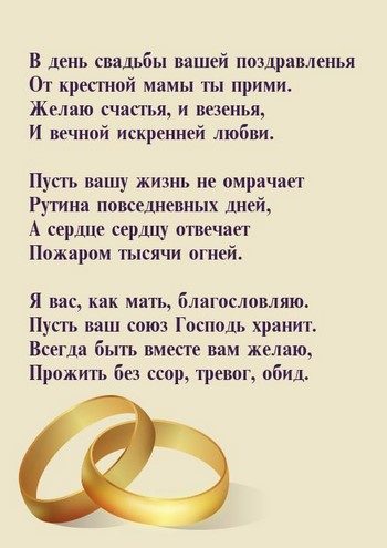 В день свадьбы вашей поздравленья От крестной мамы ты прими. Желаю счастья, и везенья, И вечной искренней любви. Пусть вашу жизнь не омрачает Рутина повседневных дней, А сердце сердцу отвечает Пожаром тысячи огней. Я вас, как мать, благословляю. Пусть ваш союз Господь хранит. Всегда быть вместе вам желаю, Прожить без ссор, тревог, обид.