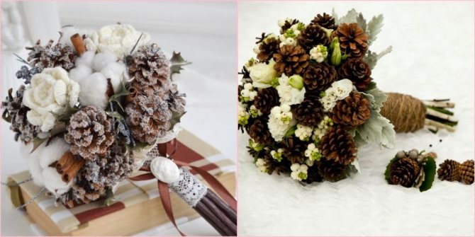 Еще одна практичная разновидность, подходящая в морозную стужу. Шишечки уместно дополнить сосновыми или еловыми ветками и хлопком.