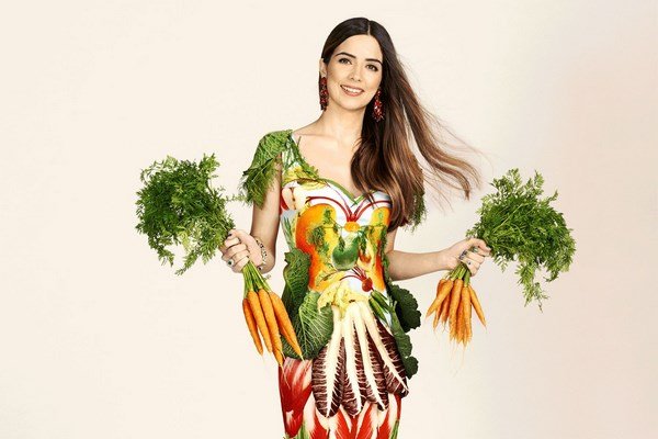 Лондонская художница Петра Стросс активно пропагандирует экологичное мышление и органические продукты, выпуская дизайнерскую одежду с фотографиями даров земли крупным планом. Некоторые изделия вдобавок декорированы реальными овощами и корнеплодами – двухмерное изображение незаметно переходит в трехмерное, предоставляя зрителю разгадывать визуальные ребусы. А еще Петра любит полевые цветы и компонует вечерние платья из кустовых роз и ромашек.