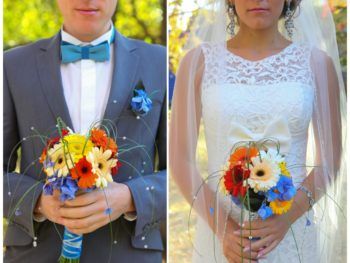 Чрезмерная красочность заявляет слишком высокий уровень контраста, а потому, если вы всё же на неё решились, то платье, причёска, макияж должны быть соответствующими – такое возможно на гавайской или, скажем, цыганской тематической свадьбе.Букет обязательно должен гармонировать как с общим оформлением свадьбы, так и с образом невесты
