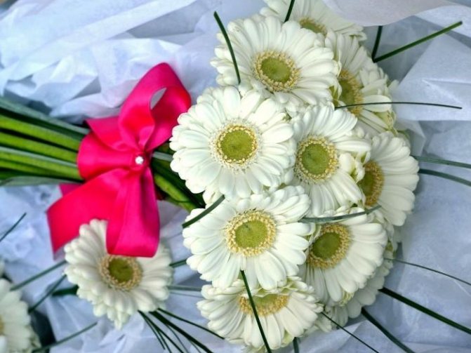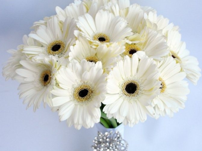 Белые цветы, окутанные неповторимым сиянием, с черными сердцевинами особенно стильно и элегантно смотрятся в качестве букета невесты. Чтобы добавить гламура такой композиции, ее можно украсить стразами, яркими ленточками или изысканными жемчужинами.