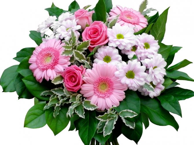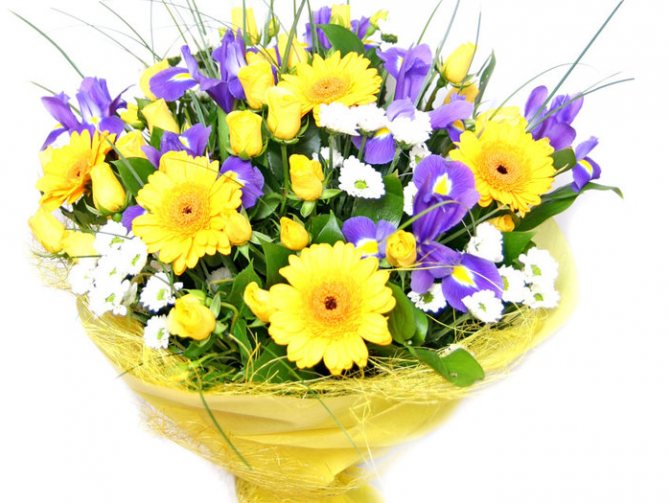 Также популярными являются композиции из этих цветов с розами или хризантемами. Такими букетами можно украсить интерьер, если внести в композицию декоративные искусственные элементы или порадовать своих близких живыми цветами.