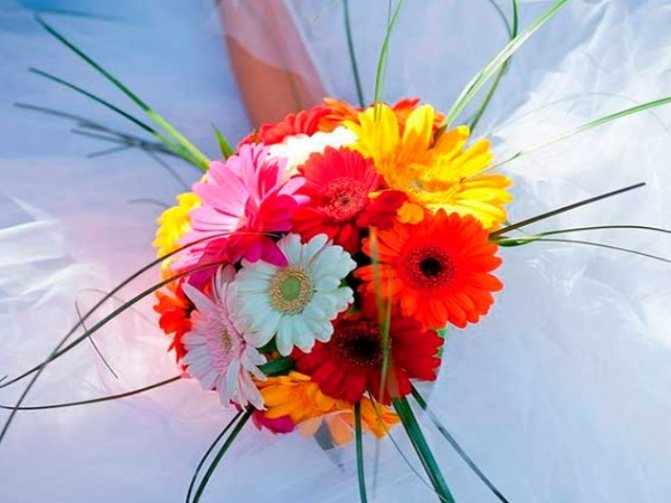 Можно сказать, что букет из гербер является своеобразным оберегом, создающим положительную ауру вокруг невесты. А это самым лучшим образом отразится на дальнейшей семейной жизни.