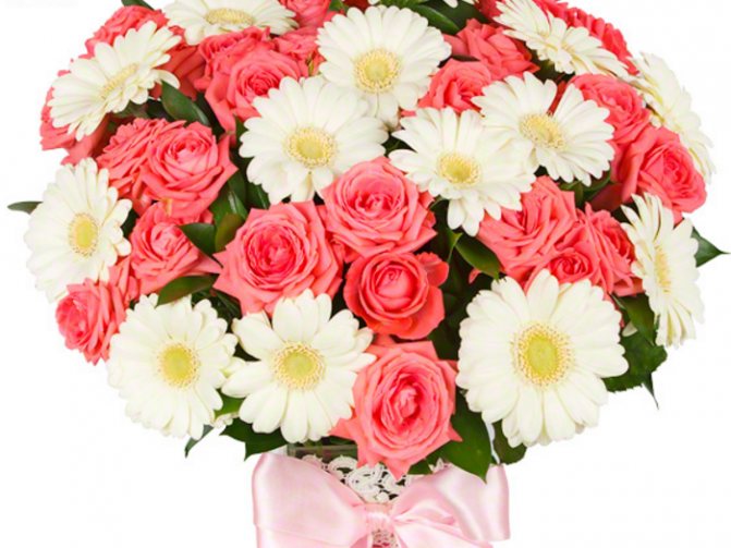 Особой популярностью среди флористов пользуются сочетания гербер с розами. Такие букеты получаются пышными, оригинальными и смотрятся изящно и богато. Кроме того, розы прекрасно переносят соседство с герберами, поэтому такой тандем никак не отражается на состоянии цветов.